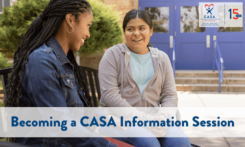 Thank you for your interest in Court Appointed Special Advocates (CASA) of Lancaster and Lebanon Counties. Our Becoming a CASA Virtual Information Session will cover the history of CASA, the role and duties of a CASA, and next steps to joining our program. A current CASA will also be at the session to share their experiences. The session will be approximately 30-45 minutes in duration.