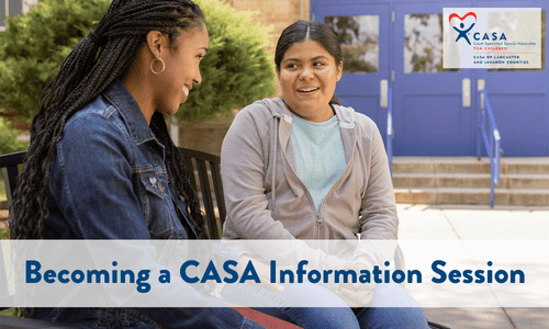 Thank you for your interest in Court Appointed Special Advocates (CASA) of Lancaster and Lebanon Counties. Our Becoming a CASA Virtual Information Session will cover the history of CASA, the role and duties of a CASA, and next steps to joining our program. A current CASA will also be at the session to share their experiences. The session will be approximately 30-45 minutes in duration.