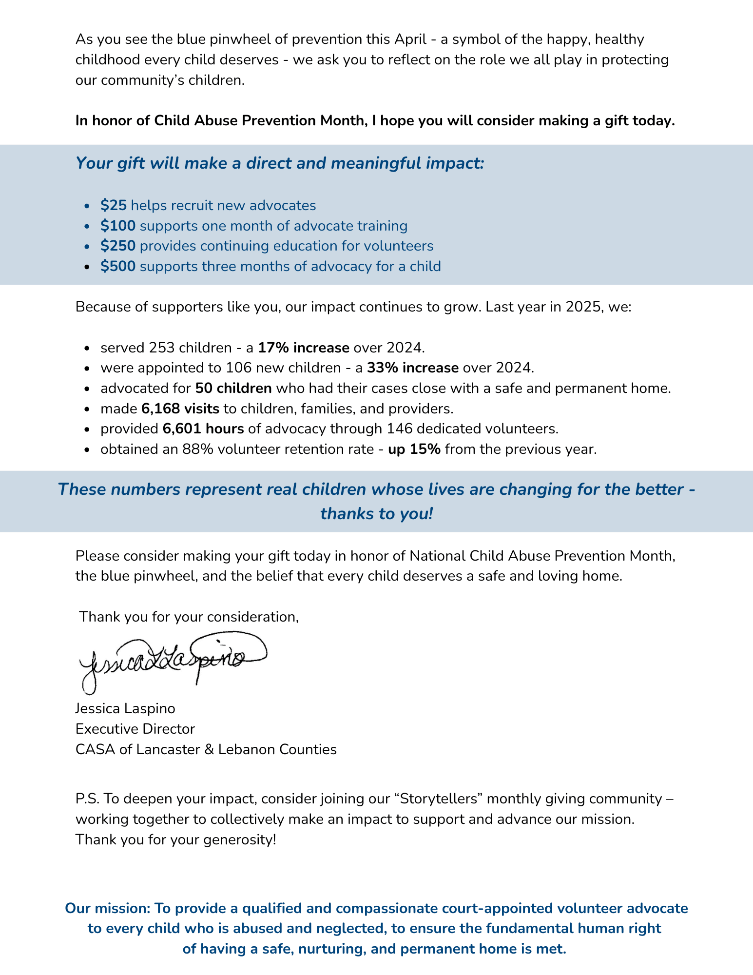 Making a gift to CASA of Lancaster & Lebanon Counties from your retirement vehicle (IRA, 401K, etc.) or your Donor Advised Fund (DAF) can be a great option for many. It can also be an efficient and savvy way to support CASA and may even provide tax savings.